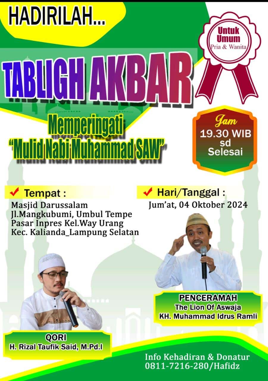 Peringatan hari besar islam itu akan berlangsung pada tanggal 4 Oktober 2024 malam, di halaman Masjid Darussalam tepatnya di Jl. Mangku Bumi (Umbul Tempe) Kelurahan Way Urang, Kecamatan Kalianda, Kabupaten Lampung Selatan.